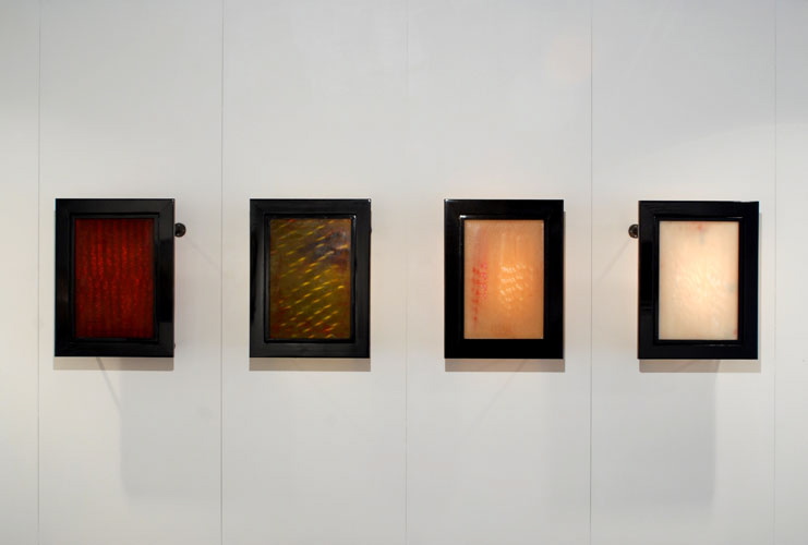 Four2, Installation view Arlington Art Center, wax forms cast in wax, pigment, each panel 32” x 24” x 12”