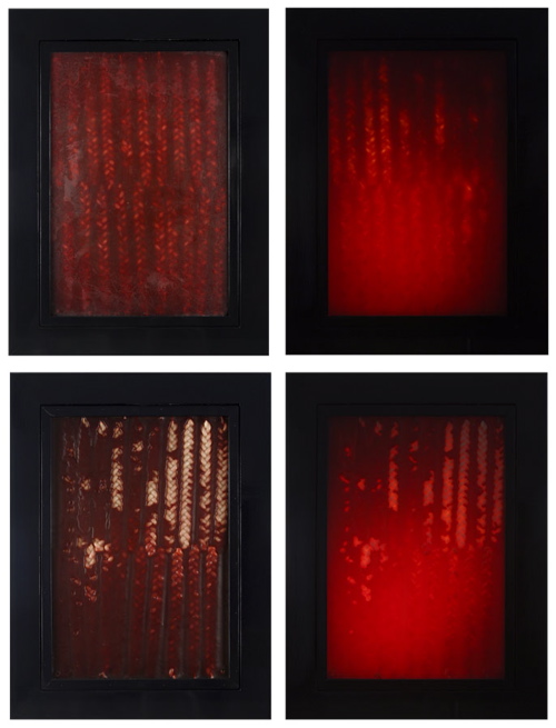 Four2 , detail of side one and side 2 red panel, wax forms cast in wax, pigment, wood frames 32” x 24” x 12”